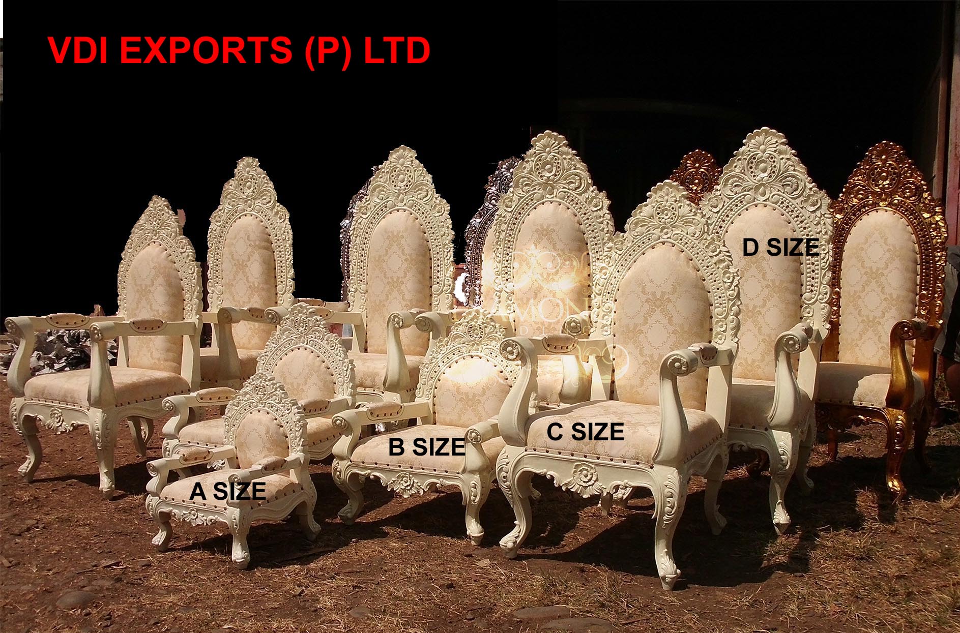 We manufacture latest wedding thrones wedding swings wedding sofa sets wedding carved furniture wedding chairs. Best material is used in making of wedding furniture. As We Manufacture and Exporters Royal Thrones Chairs Wedding Sofa Set Single Seated or Double Seated for Wedding Marriage Palaces Theme Parties or Home Decoration. We have different varieties of Wooden furniture like Wooden Carved Thrones Furniture for King�s palaces Historical Furniture Museum Furniture Early age furniture Wooden Shahi Thrones Sankheda Furniture Devdas Thrones Bollywood Furniture TV Serial Home Furniture Gold Plated Couches Silver carving three Seaters Two Seaters with golden carving Silver Shahi Thrones Royal Silver Chairs Wooden Carved Chairs Maharaja Chairs Love Seat for Bride n Groom Traditional Furniture Wedding Jaimala Chairs Banquet Hall Chairs Wedding Thrones Dining Chairs Single Chairs Living Room Chairs Fancy Designer Chairs Miscellaneous Furniture Wooden Shahi Deewans Duck Design two Seater Centre Table Miscellaneous furniture Wooden Stools. Wooden Carved furniture gives a unique look for Home Decoration Banquet Halls and Marriage Palaces Antique Design Furniture Wooden Carved Sofa Sets Royal Chair Latest Wooden Throne. We can make any type of furniture as per customers requirements.