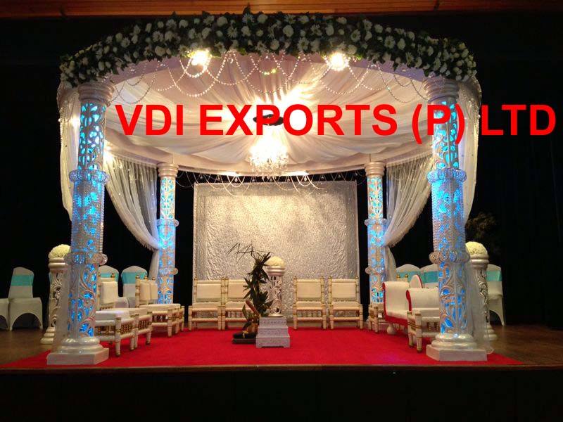 We are original manufacturers and exporters of any type of Indian Wedding Mandaps Mandap Pillars Wooden Mandaps Carved Mandaps Wrought Iron Mandaps Fiber Mandaps Wedding Stages Stalls Mandap Backdrops Aisle corridor Pillars Entrance Statues Welcome Themed Gates Lighted Pillars Mandap Furniture Mandap Carving Furniture Bride and Groom Two Seater Chairs Banquet Hall Chairs Chair Covers Bows Sashas sashes Ribbons caps Table Covers Table Runners Table Napkins Table Skirtings Canopies Tents Embroided Backdrops Plain Backdrops Lighted Backdrops Carpets Cushion Covers Flower Decoration Material Mandap Decoration Flower Chains Wedding Umbrellas Themed Umbrellas Wedding Doli Palki Palquin Swings Jhoolas Royal Thrones Catering Equipments Chaffing Dishes Karahi Stands Stainless Steel Aluminum Brass Copper Utensils of all Types Sizes Disposable Papers Thermocol Crockery Center Table Decoration items Wrought Iron Center Tables Stands Horse Drawn Wedding Carriages Cinderella Carriages Bugghies Horse Costumes Elephant Costumes Howdahs.