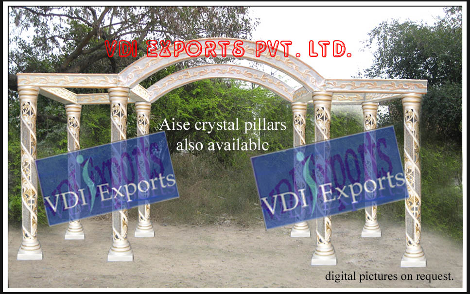 We are original manufacturers and exporters of any type of Indian Wedding Mandaps Mandap Pillars Wooden Mandaps Carved Mandaps Wrought Iron Mandaps Fiber Mandaps Wedding Stages Stalls Mandap Backdrops Aisle corridor Pillars Entrance Statues Welcome Themed Gates Lighted Pillars Mandap Furniture Mandap Carving Furniture Bride and Groom Two Seater Chairs Banquet Hall Chairs Chair Covers Bows Sashas sashes Ribbons caps Table Covers Table Runners Table Napkins Table Skirtings Canopies Tents Embroided Backdrops Plain Backdrops Lighted Backdrops Carpets Cushion Covers Flower Decoration Material Mandap Decoration Flower Chains Wedding Umbrellas Themed Umbrellas Wedding Doli Palki Palquin Swings Jhoolas Royal Thrones Catering Equipments Chaffing Dishes Karahi Stands Stainless Steel Aluminum Brass Copper Utensils of all Types Sizes Disposable Papers Thermocol Crockery Center Table Decoration items Wrought Iron Center Tables Stands Horse Drawn Wedding Carriages Cinderella Carriages Bugghies Horse Costumes Elephant Costumes Howdahs.