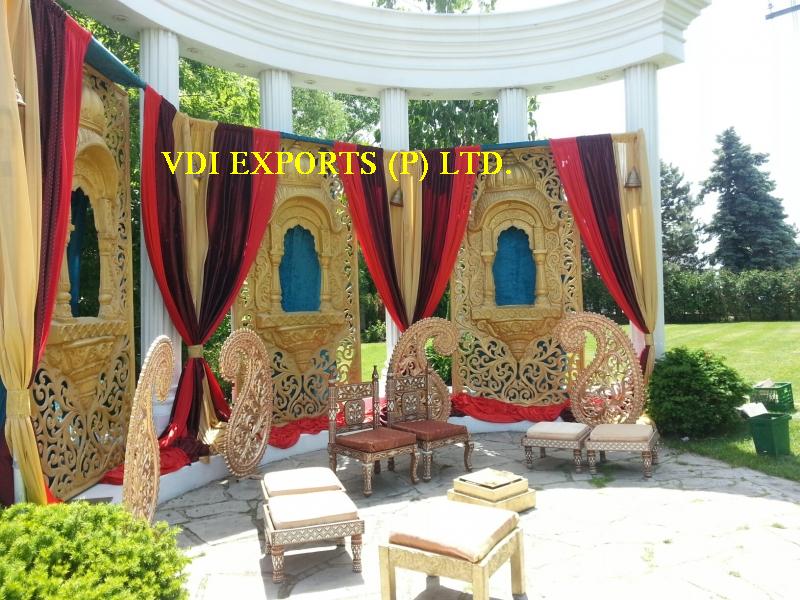 We are original manufacturers and exporters of any type of Indian Wedding Mandaps Mandap Pillars Wooden Mandaps Carved Mandaps Wrought Iron Mandaps Fiber Mandaps Wedding Stages Stalls Mandap Backdrops Aisle corridor Pillars Entrance Statues Welcome Themed Gates Lighted Pillars Mandap Furniture Mandap Carving Furniture Bride and Groom Two Seater Chairs Banquet Hall Chairs Chair Covers Bows Sashas sashes Ribbons caps Table Covers Table Runners Table Napkins Table Skirtings Canopies Tents Embroided Backdrops Plain Backdrops Lighted Backdrops Carpets Cushion Covers Flower Decoration Material Mandap Decoration Flower Chains Wedding Umbrellas Themed Umbrellas Wedding Doli Palki Palquin Swings Jhoolas Royal Thrones Catering Equipments Chaffing Dishes Karahi Stands Stainless Steel Aluminum Brass Copper Utensils of all Types Sizes Disposable Papers Thermocol Crockery Center Table Decoration items Wrought Iron Center Tables Stands Horse Drawn Wedding Carriages Cinderella Carriages Bugghies Horse Costumes Elephant Costumes Howdahs.