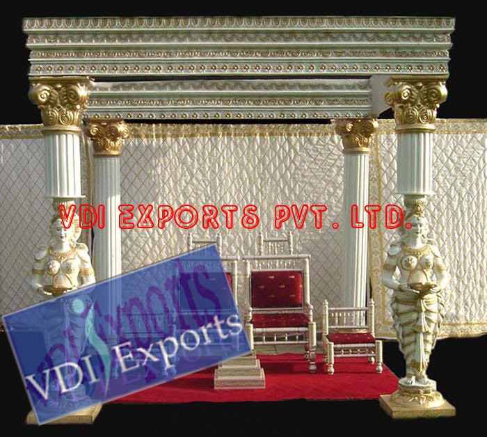 We are original manufacturers and exporters of any type of Indian Wedding Mandaps Mandap Pillars Wooden Mandaps Carved Mandaps Wrought Iron Mandaps Fiber Mandaps Wedding Stages Stalls Mandap Backdrops Aisle corridor Pillars Entrance Statues Welcome Themed Gates Lighted Pillars Mandap Furniture Mandap Carving Furniture Bride and Groom Two Seater Chairs Banquet Hall Chairs Chair Covers Bows Sashas sashes Ribbons caps Table Covers Table Runners Table Napkins Table Skirtings Canopies Tents Embroided Backdrops Plain Backdrops Lighted Backdrops Carpets Cushion Covers Flower Decoration Material Mandap Decoration Flower Chains Wedding Umbrellas Themed Umbrellas Wedding Doli Palki Palquin Swings Jhoolas Royal Thrones Catering Equipments Chaffing Dishes Karahi Stands Stainless Steel Aluminum Brass Copper Utensils of all Types Sizes Disposable Papers Thermocol Crockery Center Table Decoration items Wrought Iron Center Tables Stands Horse Drawn Wedding Carriages Cinderella Carriages Bugghies Horse Costumes Elephant Costumes Howdahs.