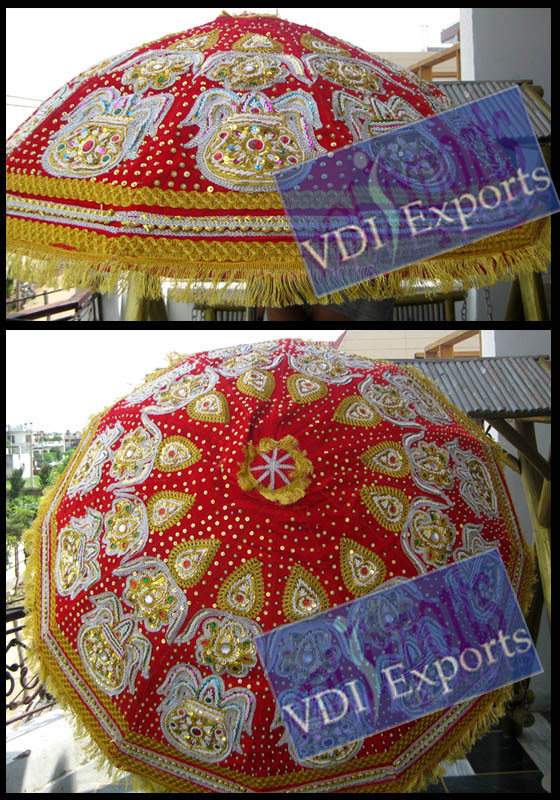We Manufacture and Exports Wedding Umbrella and Parasols for Wedding Celebration Carnival parades for Holy processions in various fabrics like satin bright fabric cotton silk with embroidered work on it in multicolor designs. We have Heavy Embroidered Umbrella Custom made Umbrella Valvet fabric Umbrella Plain Fabric Umbrella with Hanging Tassels Umberlla with Hanging Frill Royal Pearl Beading Parasol Garden Historical film Parasols King�s Parasols Elephant Over shed Parasol Umbrella with laces Jaipuri theme Red Umbrella with hanging crystalsUmbrella Patch work Umbrella Beach Umbrella Rani Wedding Parasol Net Fabric Parasol with hanging tussels Parasols with Red Sequins Procession Umbrella Pearl Beading Parasols purple fabric Parasol Embroidery Rajasthani Theme Umbrella etc.