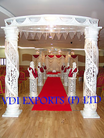 We are original manufacturers and exporters of any type of Indian Wedding Mandaps Mandap Pillars Wooden Mandaps Carved Mandaps Wrought Iron Mandaps Fiber Mandaps Wedding Stages Stalls Mandap Backdrops Aisle corridor Pillars Entrance Statues Welcome Themed Gates Lighted Pillars Mandap Furniture Mandap Carving Furniture Bride and Groom Two Seater Chairs Banquet Hall Chairs Chair Covers Bows Sashas sashes Ribbons caps Table Covers Table Runners Table Napkins Table Skirtings Canopies Tents Embroided Backdrops Plain Backdrops Lighted Backdrops Carpets Cushion Covers Flower Decoration Material Mandap Decoration Flower Chains Wedding Umbrellas Themed Umbrellas Wedding Doli Palki Palquin Swings Jhoolas Royal Thrones Catering Equipments Chaffing Dishes Karahi Stands Stainless Steel Aluminum Brass Copper Utensils of all Types Sizes Disposable Papers Thermocol Crockery Center Table Decoration items Wrought Iron Center Tables Stands Horse Drawn Wedding Carriages Cinderella Carriages Bugghies Horse Costumes Elephant Costumes Howdahs.