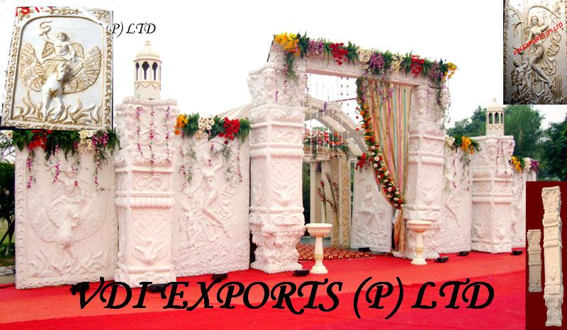 We are original manufacturers and exporters of any type of Indian Wedding Mandaps Mandap Pillars Wooden Mandaps Carved Mandaps Wrought Iron Mandaps Fiber Mandaps Wedding Stages Stalls Mandap Backdrops Aisle corridor Pillars Entrance Statues Welcome Themed Gates Lighted Pillars Mandap Furniture Mandap Carving Furniture Bride and Groom Two Seater Chairs Banquet Hall Chairs Chair Covers Bows Sashas sashes Ribbons caps Table Covers Table Runners Table Napkins Table Skirtings Canopies Tents Embroided Backdrops Plain Backdrops Lighted Backdrops Carpets Cushion Covers Flower Decoration Material Mandap Decoration Flower Chains Wedding Umbrellas Themed Umbrellas Wedding Doli Palki Palquin Swings Jhoolas Royal Thrones Catering Equipments Chaffing Dishes Karahi Stands Stainless Steel Aluminum Brass Copper Utensils of all Types Sizes Disposable Papers Thermocol Crockery Center Table Decoration items Wrought Iron Center Tables Stands Horse Drawn Wedding Carriages Cinderella Carriages Bugghies Horse Costumes Elephant Costumes Howdahs.