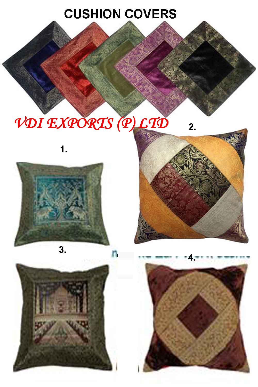 We exports all types of cushion covers Like Heavy embroidered cushion cover. Cushion Covers Indian Cushion Covers Fashion Cushion Covers Embroidered Cushion Covers Silk cushion covers Carpets for Museums V I P conferences Halls various types of Table Skirting with Logo�s for conference halls Dining Table Skirting Decorated Food Stalls . We prepare Patch work Custom made Rajasthani Gujrati theme cushion covers Banquet Hall Chair Covers Canopies Arrangement for all theme parties. We provide samples of fabric that we use like Cotton fabric Satin Tissue Net fabric Lycra Bright Silk Chiffon Wrinkled fabric Embroidered fabric in all sizes n color.