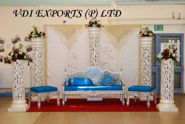 This shahi wedding throne is specially made for wedding for bride and groom sitting. It is well made and fine painted in silver color. As We Manufacture and Exporters Royal Thrones Chairs Wedding Sofa Set Single Seated or Double Seated for Wedding Marriage Palaces Theme Parties or Home Decoration. We have different varieties of Wooden furniture like Wooden Carved Thrones Furniture for King�s palaces Historical Furniture Museum Furniture Early age furniture Wooden Shahi Thrones Sankheda Furniture Devdas Thrones Bollywood Furniture TV Serial Home Furniture Gold Plated Couches Silver carving three Seaters Two Seaters with golden carving Silver Shahi Thrones Royal Silver Chairs Wooden Carved Chairs Maharaja Chairs Love Seat for Bride n Groom Traditional Furniture Wedding Jaimala Chairs Banquet Hall Chairs Wedding Thrones Dining Chairs Single Chairs Living Room Chairs Fancy Designer Chairs Miscellaneous Furniture Wooden Shahi Deewans Duck Design two Seater Centre Table Miscellaneous furniture Wooden Stools. Wooden Carved furniture gives a unique look for Home Decoration Banquet Halls and Marriage Palaces Antique Design Furniture Wooden Carved Sofa Sets Royal Chair Latest Wooden Throne.